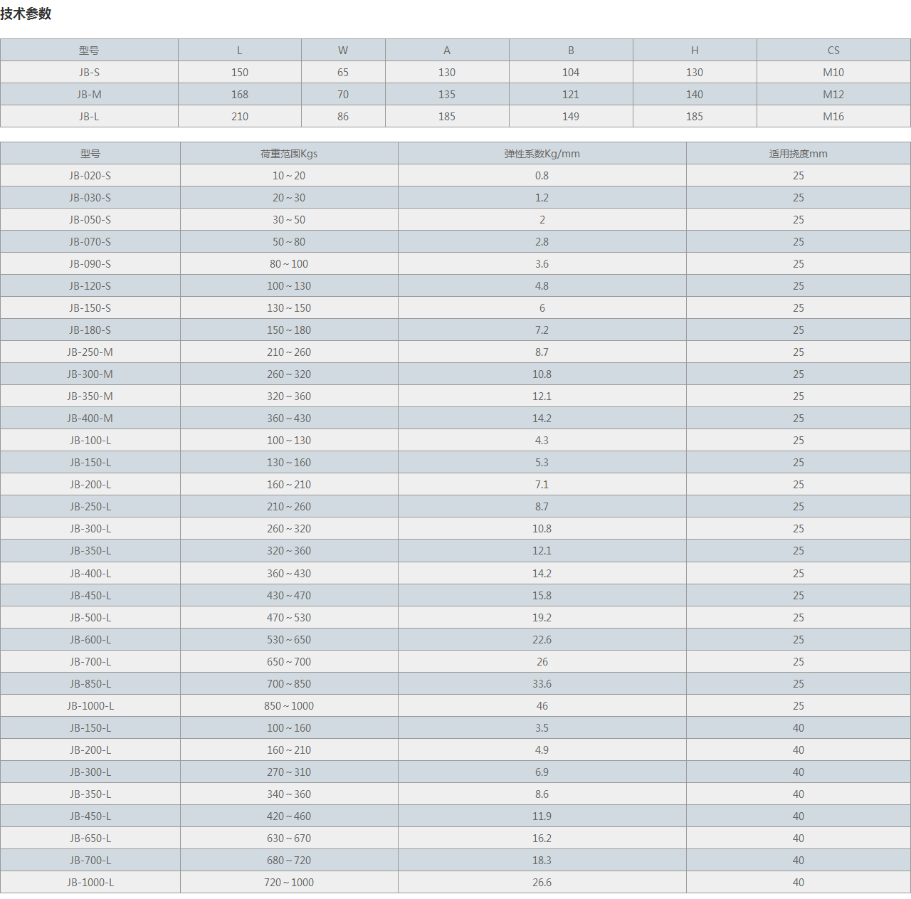型號 荷重范圍Kgs 彈性系數Kg/mm 適用撓度mm