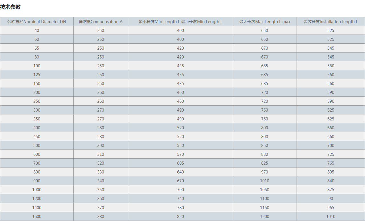 公稱直徑Nominal Diameter DN 伸縮量Compensation A 很小長度Min Length L 很小長度Min Length L 很大長度Max Length L max 安裝長度Installation length L